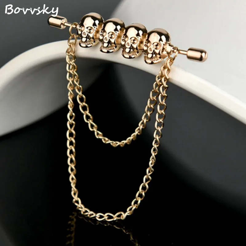 Best Price Bovvsky double chain Tassel brooch pin Clip Collar Shirt Male Accessories Fashion Collar Pin Skull skeleton Clip Men Brooch